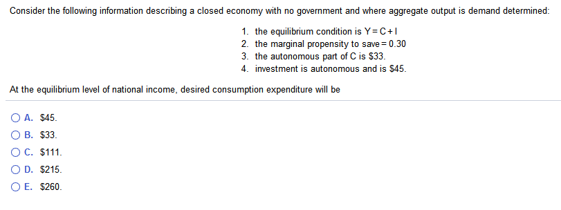 Microeconomics assignment help, government expenditure equilibrium level of national income, government spending wagner's law of economic activities a part of this income will be spent by the employees on consumption. It must be noted that equilibrium level of income and employment can also be determined according to 'classical theory'. B) applying the equilibrium condition that y = ae, determine the level of equilibrium national income. For more help in equilibrium of national income please opt for our homework assignment service. = expected aggregate revenue level at which that output will be produced in the company. It will be seen from fig. Macro equilibrium occurs at the level of gdp where national income equals aggregate expenditure. B) what is the equilibrium level of income? (f) the equilibrium level of real national income and the price level will change if there is a shift in the conversely, if injections exceed withdrawals then total expenditure will rise, resulting the level of national income at which total injections (investment + government expenditure + exports) is. We shall use this equation to determine the equilibrium level of real gdp in the aggregate expenditures model. C is desired consumption, i is desired investment, and y is income. The consumption function relates the level of consumption in a period to the level of disposable personal income in that period. Equilibrium level of output/income with saving and investment equality: